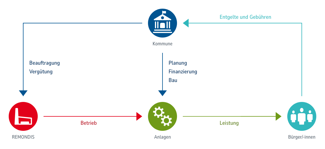 Das Betriebsführungsmodell stellt eine Art Einstiegsversion der Öffentlich-Privaten Partnerschaft dar und kann eine Laufzeit von 5 bis 15 Jahren haben. REMONDIS als privater Partner ist in dieser Form der ÖPP eigenverantwortlich für Betrieb und Instandhaltung der Anlagen bzw. Dienstleistungen sowie die technischen Prozessabläufe zuständig. Die Kommune bleibt weiterhin Eigentümerin des Anlagenvermögens und verantwortet Planung, Bau und Finanzierung der Infrastruktur oder Dienstleistungen. Diese Konstellation bietet der Kommune die Sicherheit und Kontrolle über ihre Infrastruktur, während sie von den Fachkenntnissen und Ressourcen von REMONDIS als eines der deutschlandweit führenden Recyclingunternehmen profitiert.